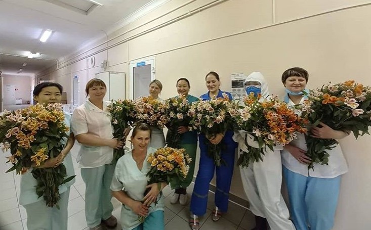В Бурятии вылечившаяся от коронавируса пациента Гусинооозёрской центральной районной больницы сделала приятный сюрприз медикам. Она подарила им восемь больших букетов цветов. Фотографией поделился минздрав Бурятии.