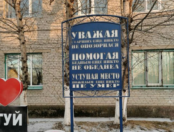 На стенде указаны следующие цитаты: «Уважая старших — ещё никто не опозорился. Помогая бедным — ещё никто не обеднел. Уступая место пожилым — ещё никто не умер».