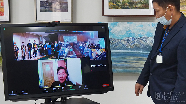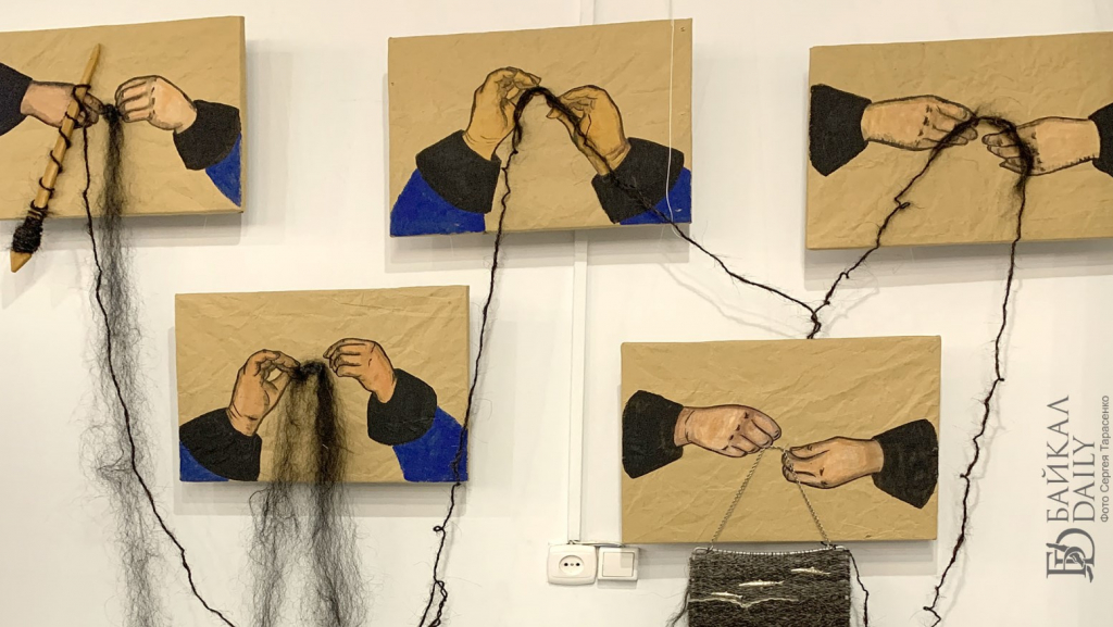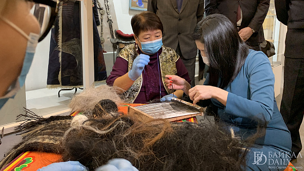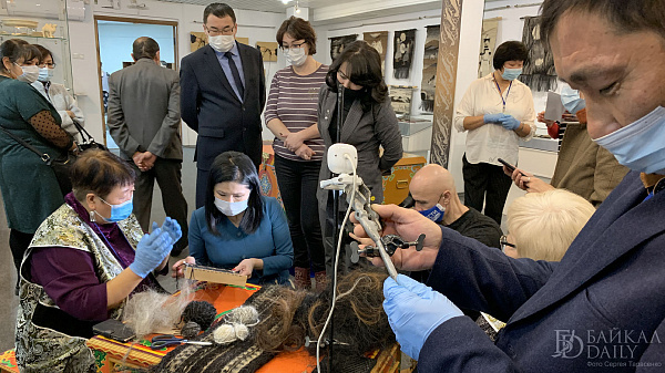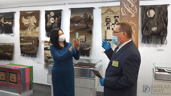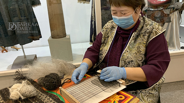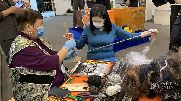 На выставке мастер-класс по плетению гобелена прошла вместе с другими желающими министр культуры Бурятии Соелма Дагаева. Она сделала пару рядов на станке под руководством мастера.
