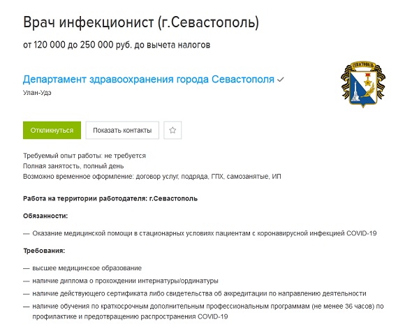 Замыкает десятку самых «дорогих» предложений в Бурятии вакансия врача-инфекциониста, предполагающая переезд в Севастополь: успешный кандидат может претендовать от 120 до 250 тысяч рублей в месяц до вычета налогов. Среди требований указано не только высшее медицинское образование, также необходимо наличие обучения по краткосрочным дополнительным профессиональным программам по профилактике и предотвращению распространения COVID-19.