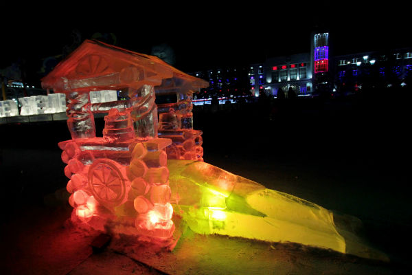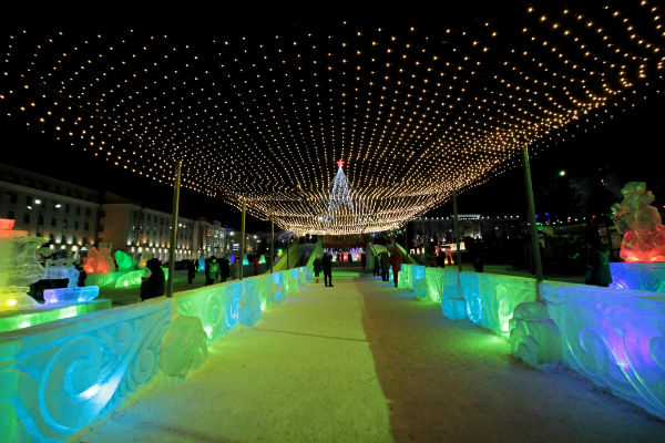 Ежедневно с 17 часов одновременно с включением городского уличного освещения начинают подсвечиваться все ледяные скульптуры в ледовом городке.