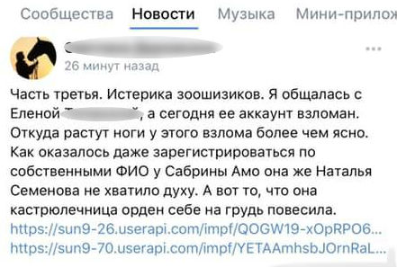 - Господа хакеры, как вам такое? Прислали мне один пост, в котором меня обвиняют во взломе аккаунта какой-то, не очень хорошо разбирающейся в механизмах социальных сетей, женщины. Вероятно, на почве истерии вокруг моего поста про собак, у неё возникла паранойяльная идея, что ее аккаунт взломали мои единомышленники и удалили пост, в котором был коллаж из моего фото и фото изуродованного агрессивными собаками лица Татьяны Л., - поделилась Наталья Семёнова.