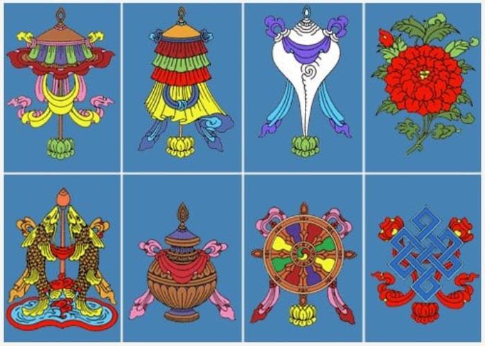 Изображения этих восьми символов украшают все виды светских и сакральных буддийских объектов. Они встречаются на резной деревянной мебели, на кованых металлических изделиях, на стенных панелях, на коврах и на шёлковой ткани. Эти восемь символов часто рисуются на дороге, ведущей в храм или монастырь, при помощи разноцветных порошков и служат знаком приветствия и почтения прибывающим именитым духовным гостям.