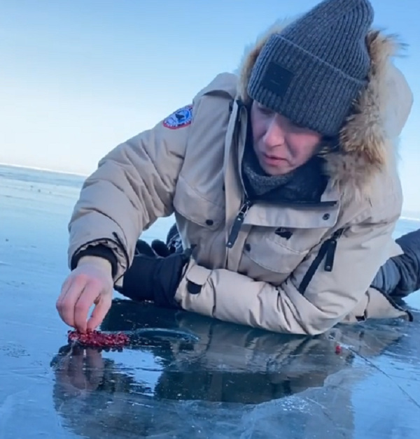 Также Чурикова попробовала «Поцелуй Байкала» - делается небольшая лунка, наливается в неё спиртной напиток, и турист должен выпить алкоголь из лунки.