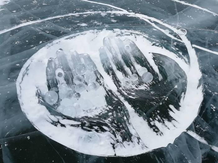 Умельцы возвели на ледяном озере две огромные ладони, в каждую из готовых сможет поместиться человек. Внутри ладоней размещены ледяные шары. Мастера думали, как же расположить шары внутри, но однажды в непогоду оставили всё на льду и ушли. Ветер поиграл с шарами и сам «положил» их.