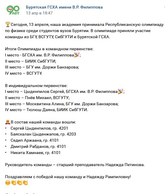 - Читаю новости и не верю глазам: в Республиканской олимпиаде по физике среди высших учебных заведений Бурятии победила команда БГСХА. В абсолютном первенстве лидировал также студент БГСХА. То есть сельскохозяйственного вуза, где нет даже кафедры физики, - поделился на своей странице Андрей Ринчино.
