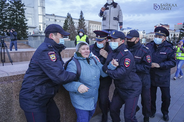Этот метод был повторён на прошлой неделе, 21 апреля, на третьей несогласованной акции в поддержку Алексея Навального. На этот раз местом действия стала площадь Советов, полицейские также перекрыли её. К слову, Наталья Филонова оказалась в числе задержанных и на этот раз. Соцсети облетел этот снимок «Байкал-Daily», сделанный во время её задержания: