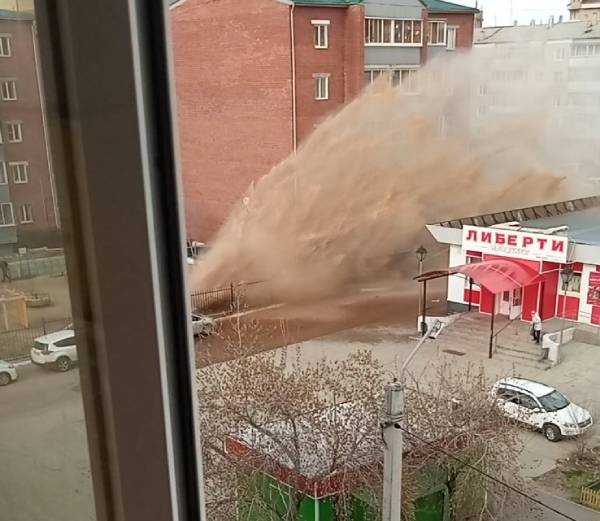 Сегодня в Улан-Удэ на проспекте Строителей образовался гигантский фонтан из-за прорыва трубы. Вода била в высоту на несколько метров.