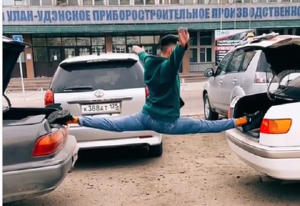Сергей поставил одну ногу на стоящий автомобиль, вторую – на машину, которая медленно двигалась вперёд. В итоге у него получился шпагат, который изумил пользователей Сети. Ролик он выложил на своей странице в соцсети, подписав: «Давно хотел снять такое видео».