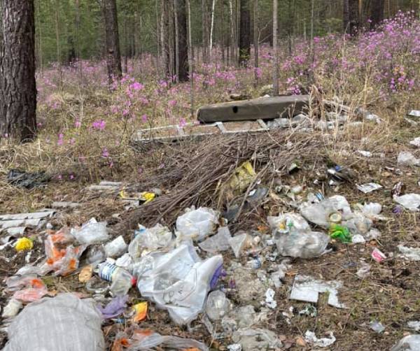 Наталья Семёнова отмечает, что яркие цветы любимого всеми багульника, практически достояния республики, утопают в мусоре. И если кто-то захочет сфотографироваться на фоне цветущих кустов, то обязательно наступит на мусор.