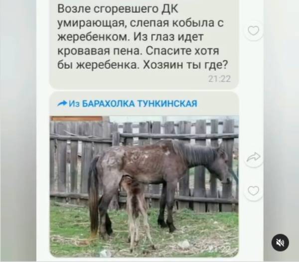 В местной тункинской группе написали об умирающей слепой кобыле – из её глаз шла кровяная пена. Лошадь вместе с жеребёнком жили около сгоревшего дома культуры.