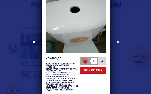 «В туалетах нашей школы необходимо провести капитальный ремонт. В прошлом году мы выиграли годовой запас Domestos, который нам очень помог в борьбе со ржавчиной и микробами! Нынче надеемся выиграть ремонт», - говорится в описании.