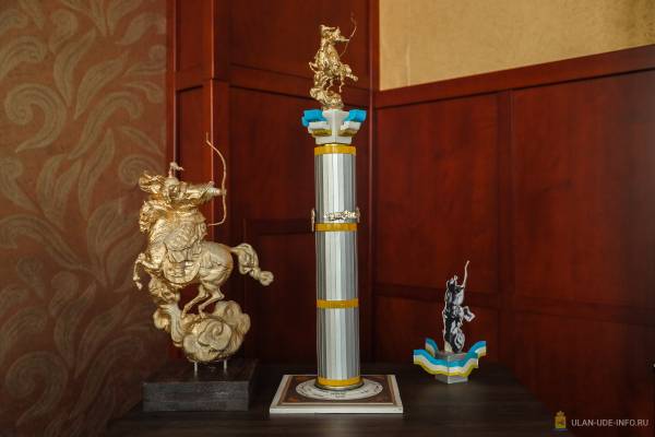 Победители представили проект под названием «Красные ворота» - скульптурную композицию «Гэсэр». Бронзовая золочёная статуя героя бурятского эпоса венчает колонну, декорированную капителью и символическим хадаком.