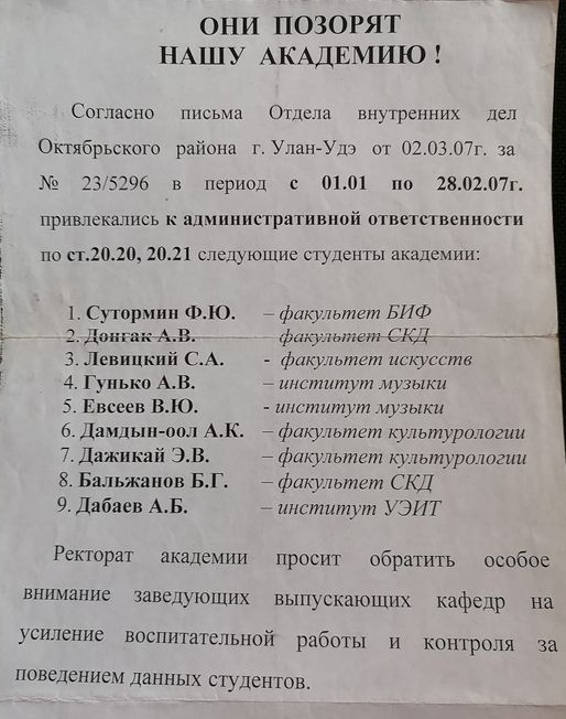 В объявлении говорится следующее: «Согласно письма отдела внутренних дел Октябрьского района города Улан-Удэ от 2 марта 2007 года за № 23/5296 в период с 01.01 по 28.02.07г. привлекались к административной ответственности по ст. 20.20, 20.21 следующие студенты академии», далее перечисляются учащиеся.