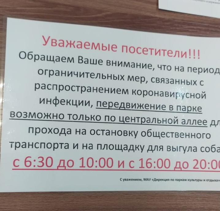 Также в период с 6:30 до 10:00 и с 16:00 до 20:00 открыт проход на площадку для выгула собак. Скамейки для отдыха временно перекрыты.
