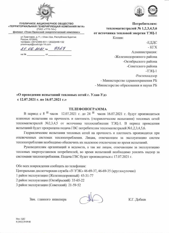 - Гидравлические испытания тепловых сетей на прочность и плотность производятся при отключённых системах теплопотребления. Лицам, отвечающим за эксплуатацию систем теплопотребления необходимо обеспечить их надёжное отключение во время испытаний, - говорится в телефонограмме ТГК-14.