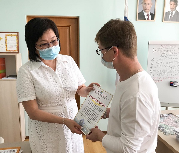5 июля министр здравоохранения Бурятии Евгения Лудупова и главный врач больницы скорой медицинской помощи (БСМП) Дамбинима Самбуев вручили анестезилогу-реаниматологу из Чувашии Евгению Кузнецову благодарность «За оказанную практическую помощь».