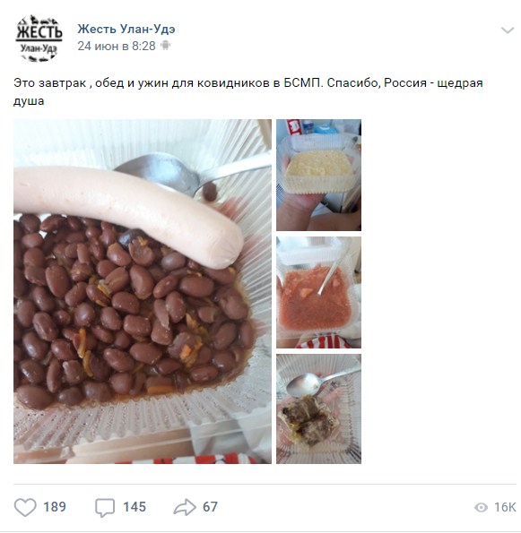 Больные ковидного стационара больницы скорой медицинской помощи (БСМП) пожаловались на питание. В бурятском паблике «Жесть Улан-Удэ» опубликовали фотографии еды, которую выдают пациентам с коронавирусом.