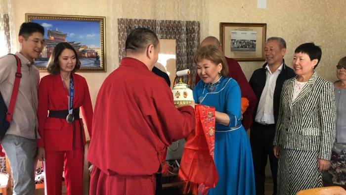 Светлана прибыла в дацан с большой делегацией, в составе которой её тренер и родные.