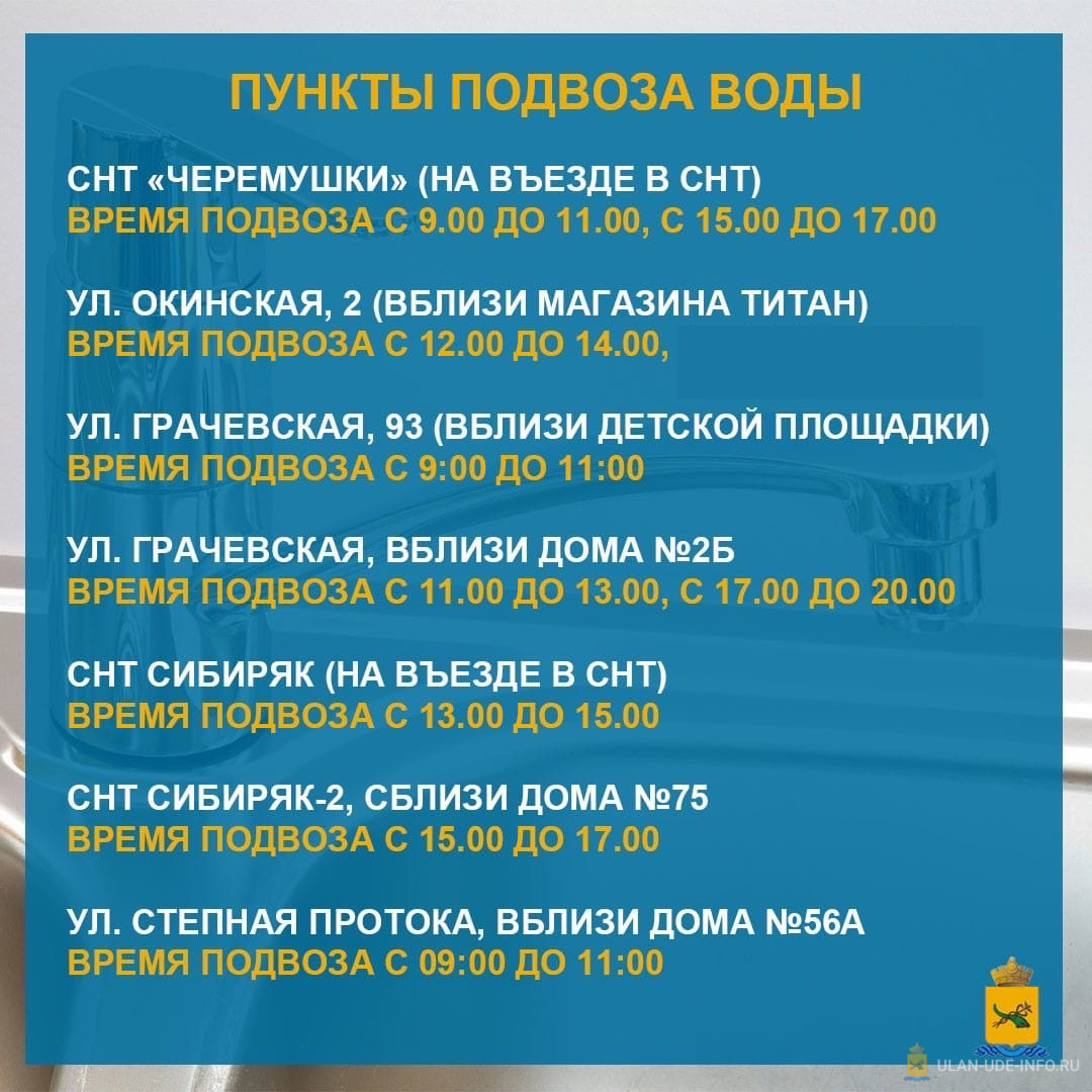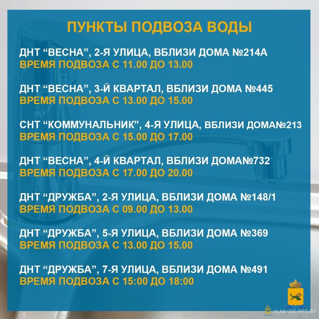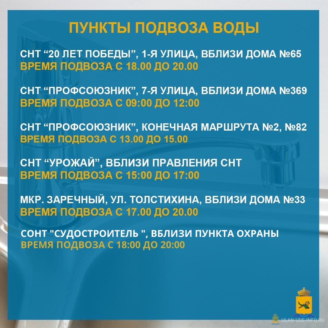В Улан-Удэ продолжается подвоз питьевой воды в СНТ «Черёмушки», СНТ «Сибиряк», ДНТ «Весна», ДНТ «Дружба», СНТ «20 лет Победы», СНТ «Профсоюзник», СНТ «Урожай», микрорайон Заречный и СОНТ «Судостроитель».