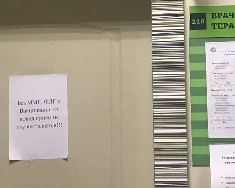 В поликлинике №2 в Улан-Удэ посетители обнаружили странное объявление на дверях кабинета участкового терапевта. Извещалось, что «приём не осуществляется без вакцинации от ковида», а также почему-то без наличия результатов флюорографии и маммографии.