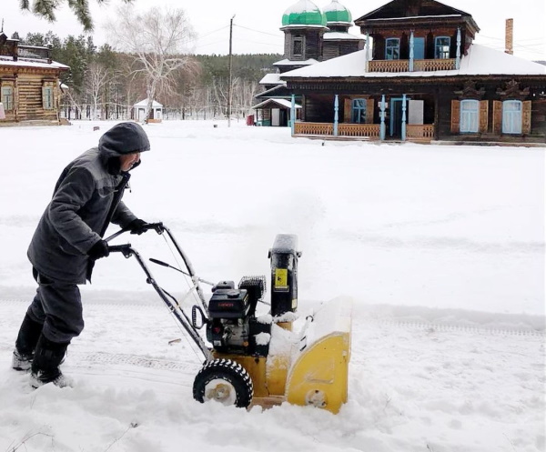 Здесь с раннего утра идёт уборка снега. Задействована вся необходимая техника, которая убирает от снега основные дорожки территории, а смотрители вручную очищают тропинки к экспозиционным домам.