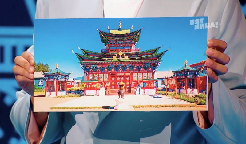 Как только Полина вышла на сцену, ей дали посмотреть фотографии зданий из разных уголков мира. Когда девочке показали Иволгинский дацан, гости признались – сами не знают, что это за здание, и где находится.
