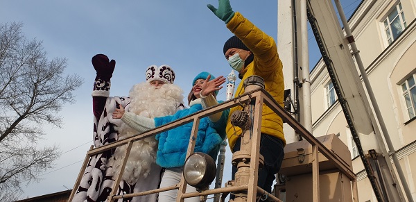 4 декабря возле детских туберкулёзной и клинической больниц развернули поздравительный штаб. Дед Мороз и Снегурочка поднялись на пожарном автоколенчатом подъёмнике. Они смогли заглянуть в каждое окно и поприветствовать детей, находящихся на длительном лечении.
