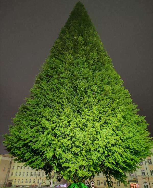 Сейчас пушистую красавицу обвешивают украшениями, и уже установили звезду. Высота главной ёлки города составляет 25,5 метров, а звезда даст ещё два метра в высоту.