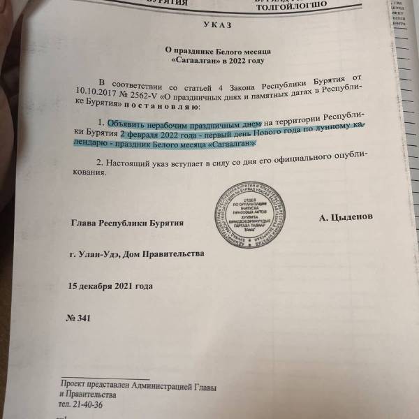 В Бурятии 2 февраля 2022 года – день наступления Нового года по лунному календарю – объявили нерабочим днем. Соответствующий указ о праздновании Сагаалгана подписал глава Бурятии Алексей Цыденов. На официальном сайте правительства его пока нет, зато указ опубликовали в официальном аккаунте администрации Тункинского района в Instagram.