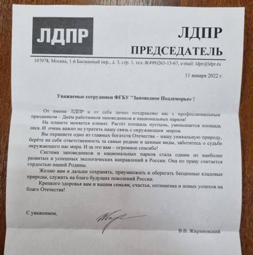 От себя лично и от партии ЛДПР Жириновский поздравил коллектив учреждения с Днём заповедников и национальных парков.