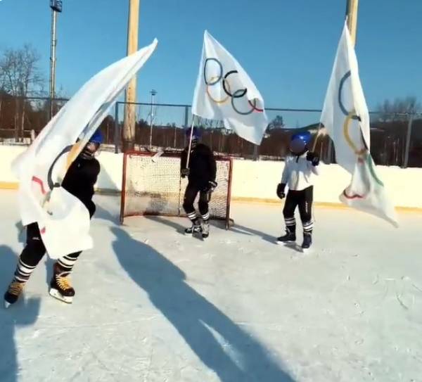 На размещенном видео хоккеисты прокатились с российским флагом и олимпийскими флагами по своему катку.