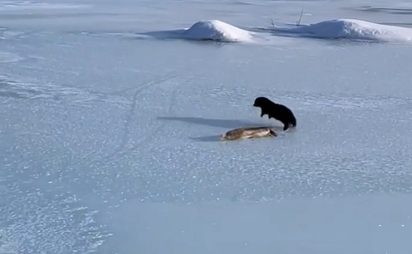 Заметив людей, норка какое-то время удирала от инспекторов, но затем бросила рыбу и убежала прочь. Видео опубликовали на странице заповедника в соцсети.