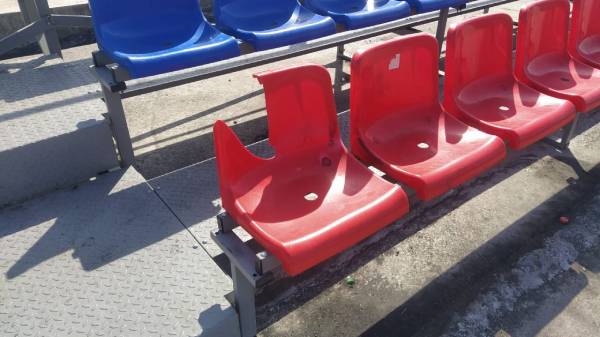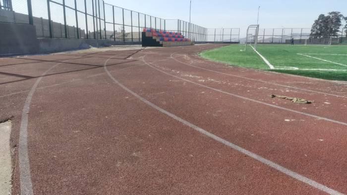 Кроме того, испорчено покрытие беговой дорожки – повсюду разбросана резиновая чёрная крошка (используется при обустройстве искусственного газона на футбольном поле) а также металлическая и деревянная стружка, бетонная смесь и песок. Местами покрытие разорвано, деформировано по краям.