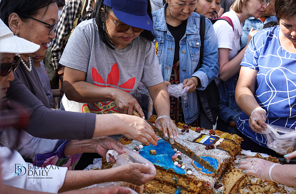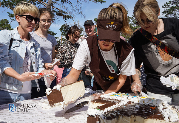 Большой ажиотаж вызвал бесплатный огромный торт. Кусочками торта угощали всех желающих.