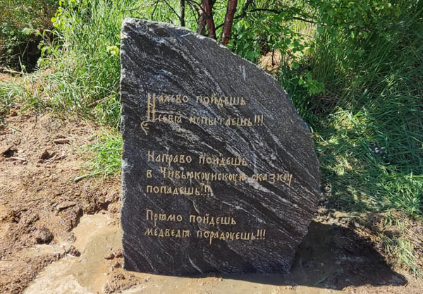 Теперь контейнерная площадка по сбору отходов перенесена на 100 метров и находится за пределами общего вида, но тем не менее остаётся в шаговой доступности. На её месте установлен красиво оформленный «вещий камень», на котором в шутливой форме нанесена информация о том, что ждёт посетителей на выбранном ими пути.