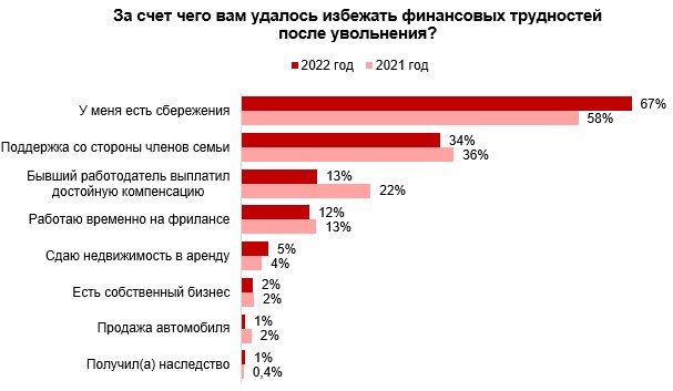 Большинство из тех, кому удалось избежать финансовых трудностей после увольнения, объясняют это наличием сбережений (67%; для сравнения: год назад в аналогичном опросе такой ответ дали 58%). Значительно реже респонденты выбирали такие варианты как поддержка со стороны членов семьи (34%), выплата достойной компенсации от бывшего работодателя (13%), подработка в формате фриланса (12%). Кроме того, 5% сдают в аренду недвижимость, 2% живут за счет собственного бизнеса, по 1% решили свои финансовые трудности после увольнения за счет продажи автомобиля и получения наследства.