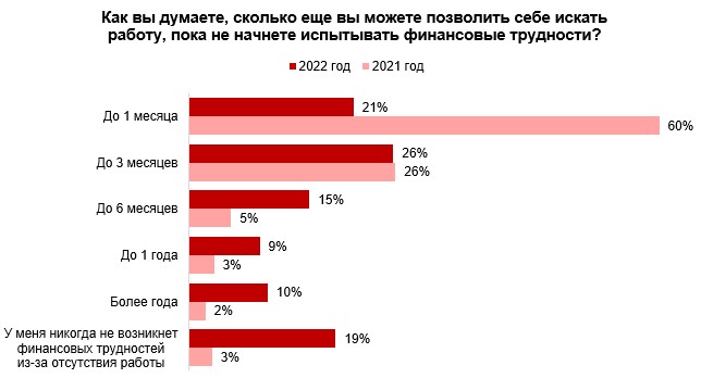 21% россиян уверены, что могут позволить себе искать работу ещё в течение месяца, после чего начнут испытывать ощутимые финансовые трудности. 26% считают, что их запаса прочности хватит на три месяца, 15% - на полгода, 9% - на год, 10% могут позволить себе искать работу и более одного года.