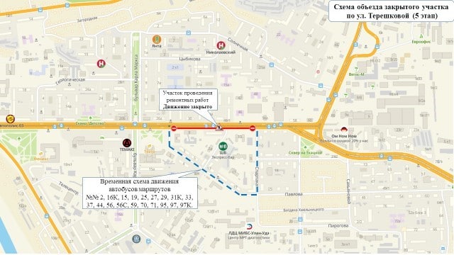 С 7 по 25 августа в Улан-Удэ будет перекрыт новый участок дороги по улице Терешковой - от улицы Павлова до улицы Спартака.