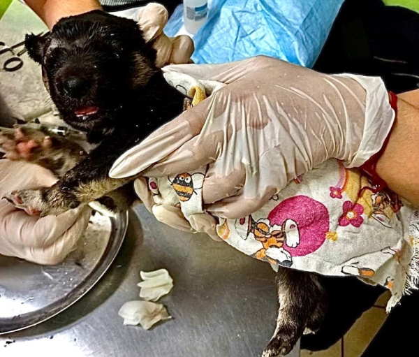 Сейчас за двумя её покусанными щенками ухаживают ветеринары. Из ран извлекли червей, и теперь выкармливают из бутылочки, поскольку Марфе их отдавать нельзя.