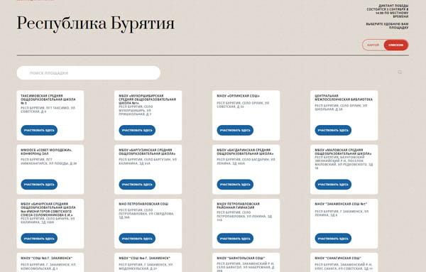 К примеру, в Иволгинском районе диктант напишут в Иволгинской межпоселенческой центральной библиотеке имени А.Д. Бадаева. В Баргузинском – в Баргузинской средней общеобразовательной школе. В Курумканском – в районном центре дополнительного образования. В Улан-Удэ площадками станут школы, гимназии, лицеи, а также БГСХА и национальный музей РБ. Посмотреть полный список площадок можно на сайте диктанта.