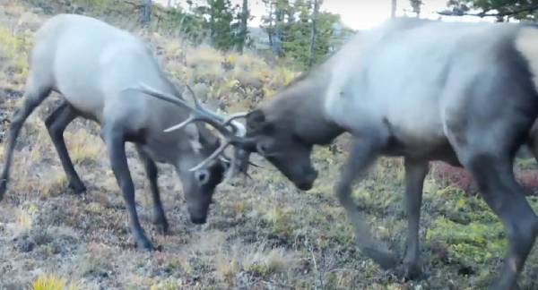 Инспекторы проверили автоматические камеры во время антибраконьерского рейда в Тункинском нацпарке в Бурятии. На дневных и ночных видеокадрах два марала — молодой и зверь постарше — по очереди наступают друг на друга, сцепившись рогами. Отчётливо слышен стук переплетённых рогов.