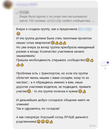 - Сами пассажиры пишем с вечера, в какое время надо будет выбраться из сотых до города, в личку откликнется водитель (если будет такой), но имейте ввиду, никаких опозданий, встреча у того места, где удобно водителю-соседу! Кто кинул клич и договорился, отписывается, что нашёл машину. Надеемся на взаимопонимание со стороны водителей и пассажиров, - обращается администратор.