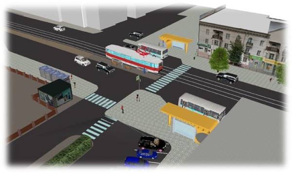 Так, здесь запретят разворот на рельсовом переезде и установят пешеходный светофор. Судя по эскизу, остановку перенесут немного поближе к магазину «Спутник», а трамвайная площадка станет ближе к пешеходному переходу.