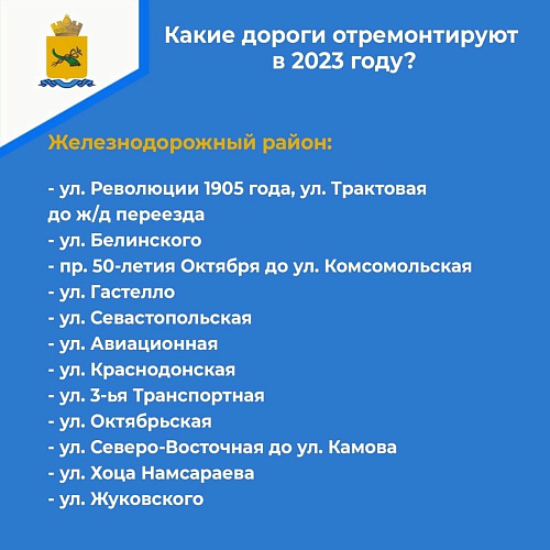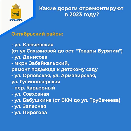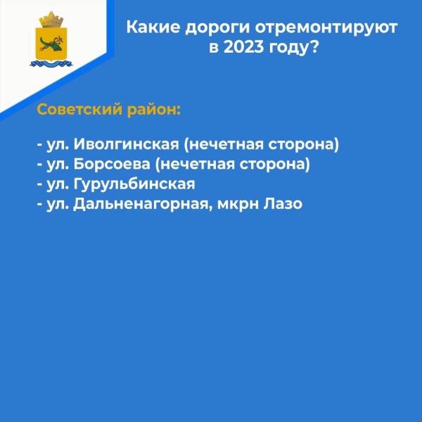 В наказах мэру города улан-удэнцы называли конкретные места, где необходимо обновить дорожное полотно: это улица Борсоева, участки в микрорайонах Горького, Загорск, Таёжный. Все они включены в ремонтную кампанию 2023 года в рамках нацпроекта «Безопасные качественные дороги». Всего обновят 25 участков дорог, в частности, улицы Борсоева, Орловская, Краснодонская, Гастелло, Севастопольская и Залесная.