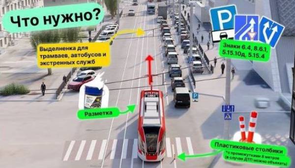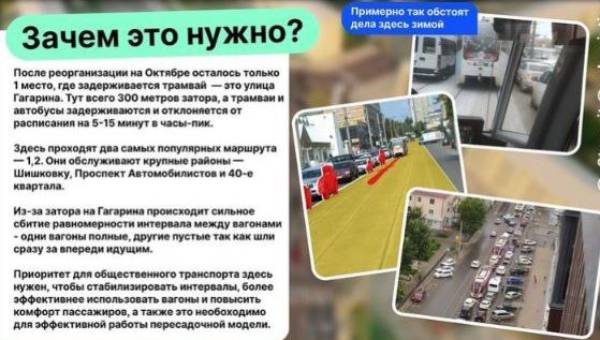 Борцы за комфортную городскую среду уверены: на этом участке, где постоянно возникают заторы, нужна отдельная полоса для трамваев, автобусов и машин экстренных служб. По их мнению, на Гагарина нужно сделать разметку и установить сигнальные столбики примерно в восьми метрах друг от друга. В паблике даже разместили схему движения и привели обоснование.