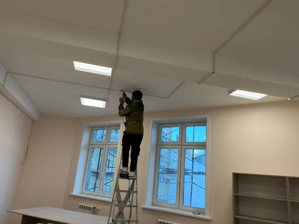 Сейчас в школе ведётся внутренняя отделка, завершается устройство внутренних сетей водоснабжения. Рабочие расставляют мебель, устанавливают интерактивные доски. В пищеблоке монтируют новая техника - индукционные плиты вместо чугунных.