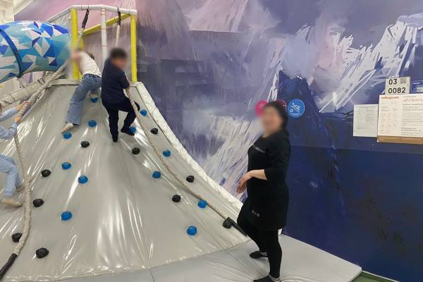 Женщина провела выходной день со своими детьми. Они сходили в батутный центр и посетили детское кафе.