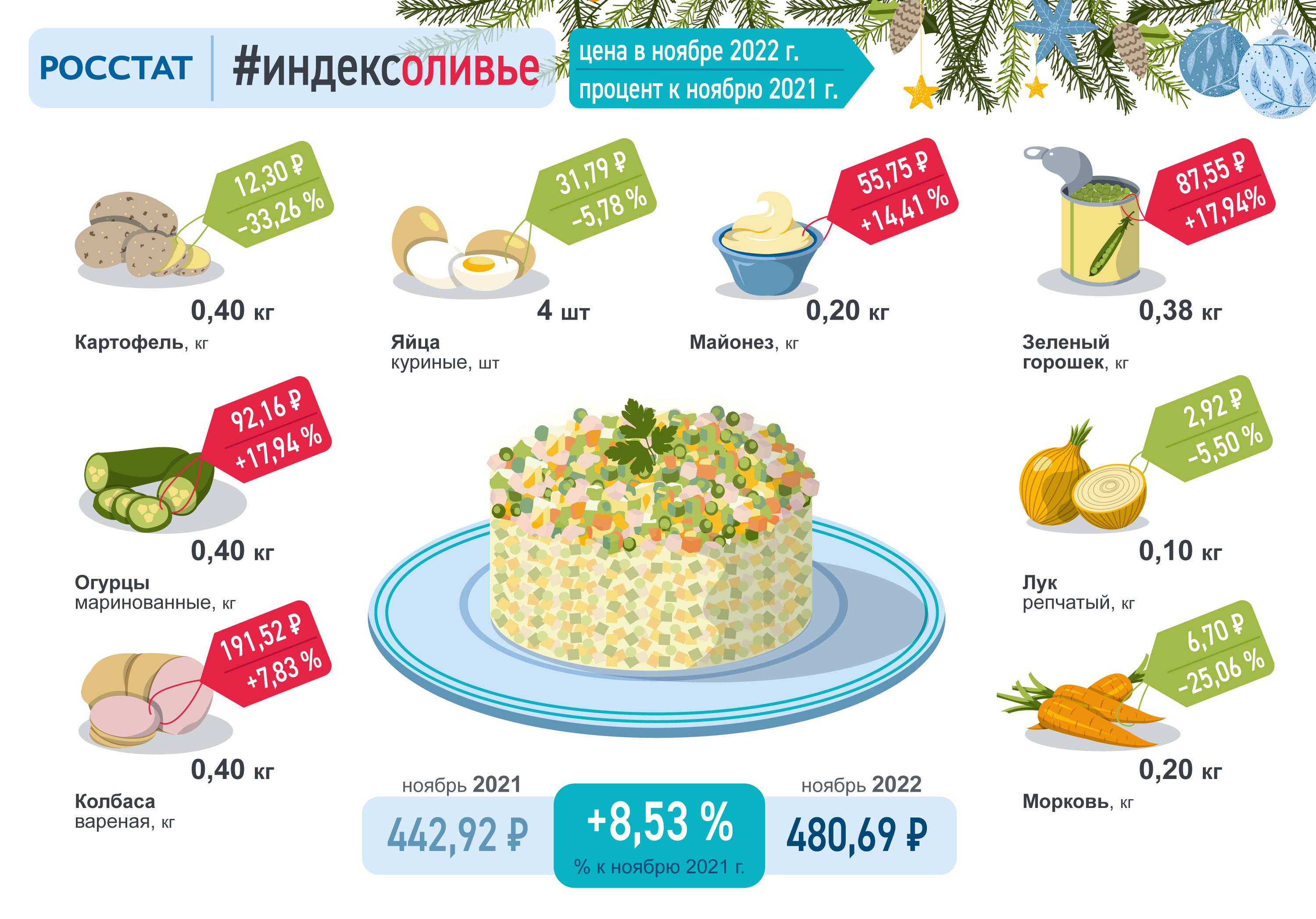 Специалисты изучили цены на необходимые ингредиенты и пришли к выводу, что за год – с ноября 2021-го по ноябрь 2022 – их стоимость в среднем по стране выросла на 8,53%. Инфляция по итогам последнего осеннего месяца составила 11,98%.