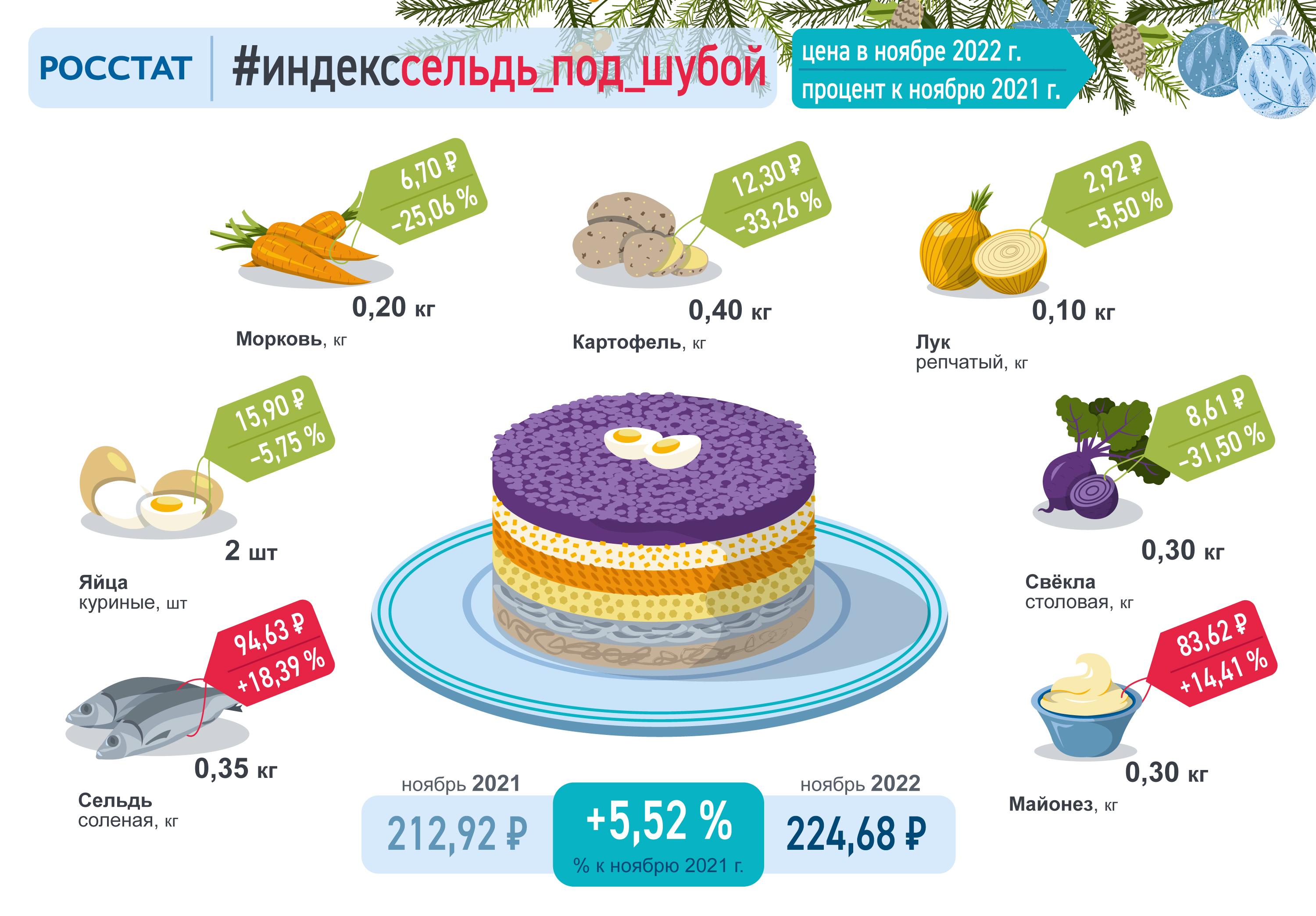 На удорожание салата «Селёдка под шубой» повлиял рост цен на сельдь (на 18,39%) и майонез (на 14,41%). Остальные пять ингредиентов – куриные яйца и овощи – подешевели. В наибольшей степени – картофель (на 33,26%), в наименьшей – лук (на 5,5%), отмечают в Росстате.